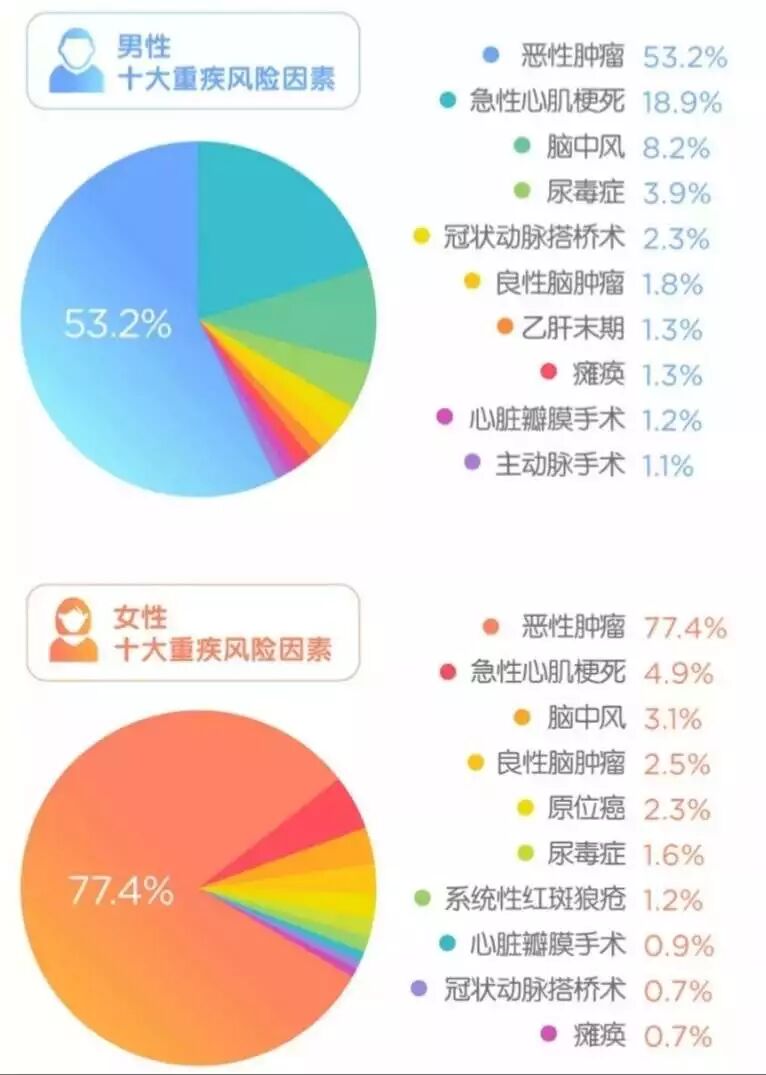 不管是女性还是男性,十大重疾前三位均是恶性肿瘤、急性心肌梗死和脑中风,然而被称为“众病之王”的恶性肿瘤,赔付率高居首位,男性为53.2%,女性更是达到了惊人的77.4%,比排名第二的心肌梗死分别高出34.3%和72.5%。