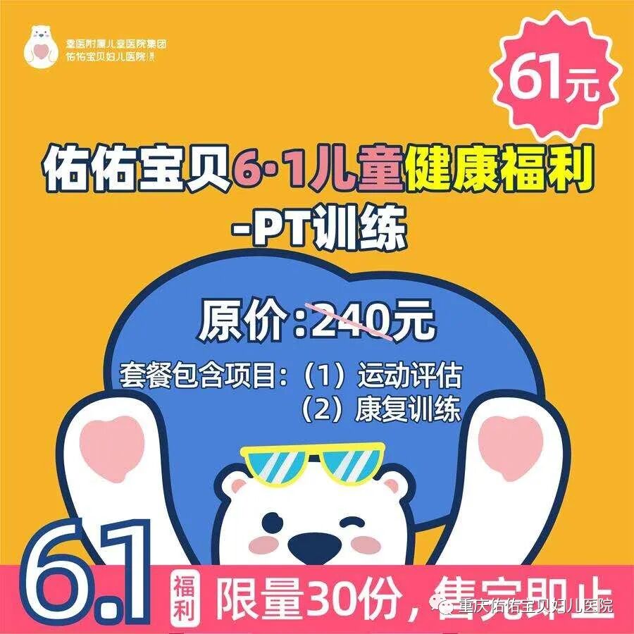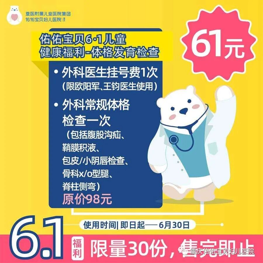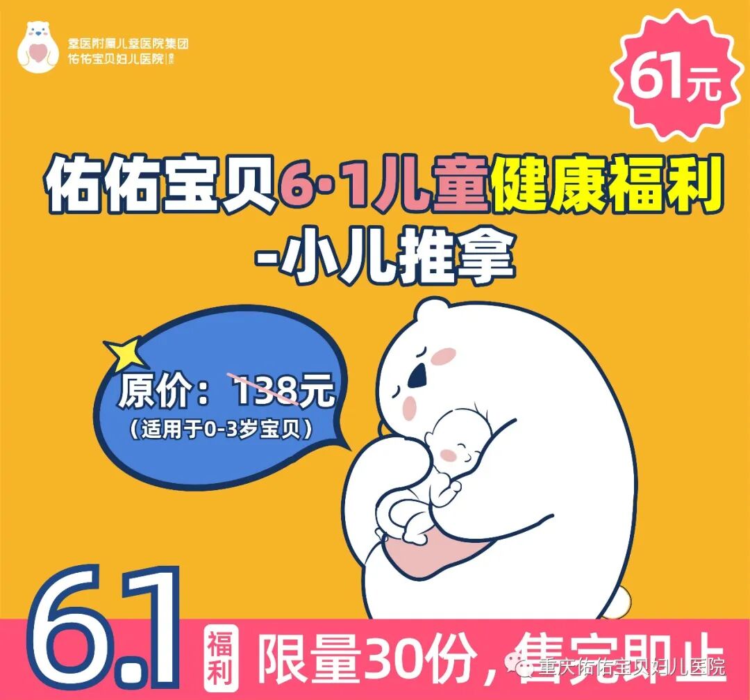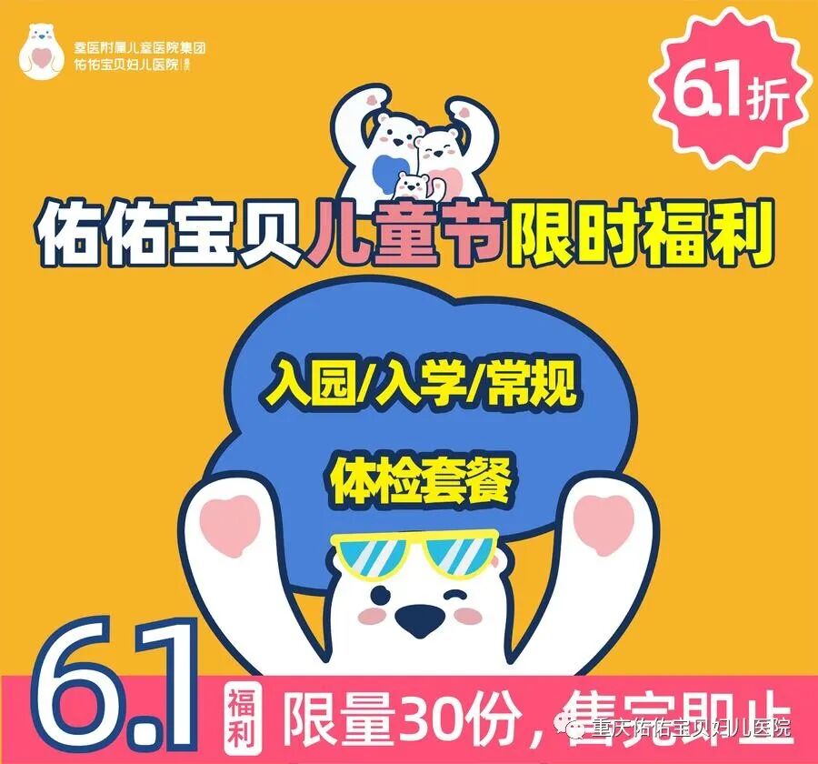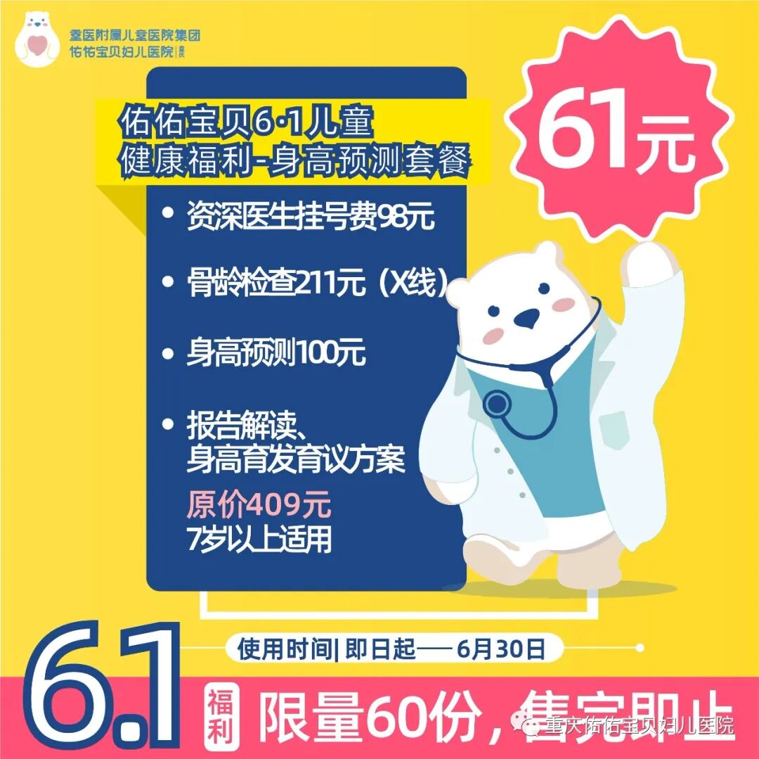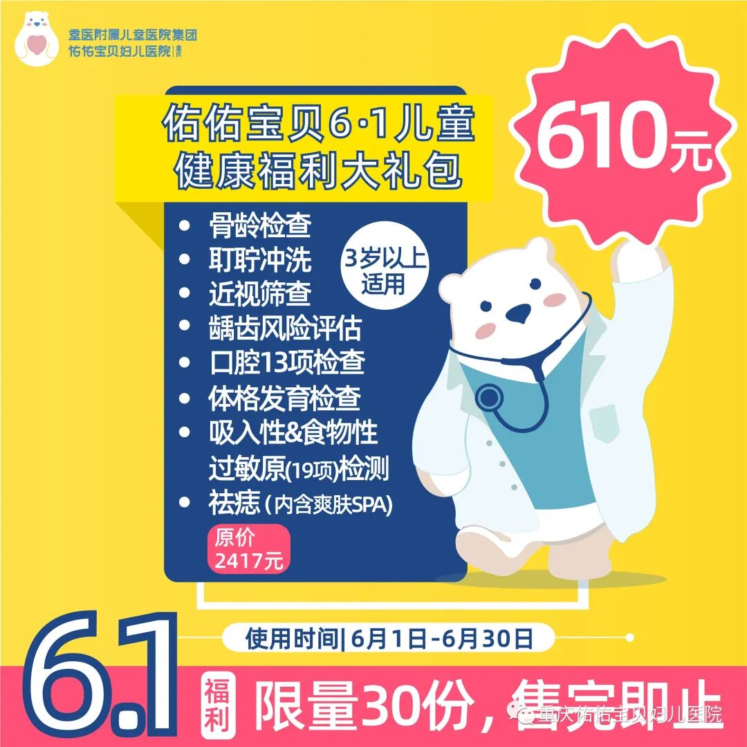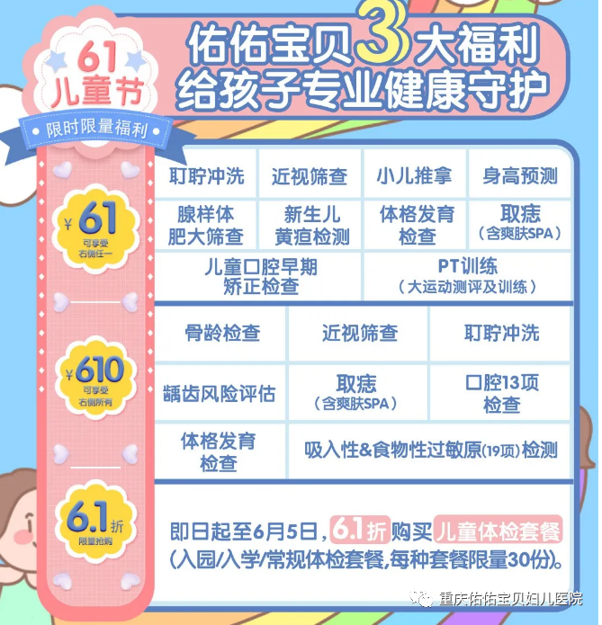 “六一”是孩子的节日!你,准备好了吗?是送娃漂亮的衣服或精心挑选的玩具?佑宝告诉你,这些并不是送给孩子最好的儿童节礼物,比这更有意义是带孩子做一次全面的体检!孩子健康,是每个家长最大的梦想在“六一”儿童节来临之际佑佑宝贝3大福利来袭给孩子专业健康守护限时优惠哦,速抢! 01 61元优惠套餐 身高预测套餐1 在这个长腿横行的时代身高,这可是每个当妈的都关心的大事都想女宝宝肤白貌美大长腿男宝宝高大帅气通南北 孩子将来会长多高呢?父母不高,孩子能突破遗传身高吗?孩子未来身高可以提前预测吗?孩子如何才能达到理想身高呢?这就需要身高预测检查帮孩子做好身高全面管理及时预警成长风险佑佑宝贝61元即可进行身高预测点击图片购买 祛痣(含爽肤SPA)套餐2  脸上肯定越干净越好,小孩也不例外痣,是一种很常见的皮肤症状说句实在的话,隐藏起来的痣还好但如果长在脸上那就...影响美观的程度可想而知想象一下,脸蛋原本白里透红没有斑没有痘但多了一颗,两颗,三颗痣那不是全毁了吗儿童时期祛痣是个比较好的选择但务必选择专业权威的医院点击图片购买 近视筛查套餐3 新冠肺炎疫情期间孩子宅在家里看电视、玩游戏、看书、写作业再加上“停课不停学”的号召孩子们用眼时间大大增加因此眼科检查很重要临近6.1儿童节佑佑宝贝福利送给您61元即可做近视筛查点击图片购买 儿童口腔早期矫正检查套餐4 牙齿就像一颗小树苗在每个生长阶段都需要精心呵护在小树苗有歪斜的情况时应及时靠外力扶正它3到15岁是儿牙矫治的黄金时期在孩子身体发育最旺盛的时候进行早期干预,不仅颌骨的塑形性强而且矫治简单更舒适治疗时间短,费用更低儿童口腔早期干预矫正不让孩子输在起跑线上点击图片购买 PT训练(大运动测评及训练)套餐5 俗话说“一举头,二抬胸,三翻六坐七滚八爬,九扶立周会走”从宝宝人生第一次体检开始家长们往往首先关注到宝宝的大运动水平:“医生,我家宝宝运动发育有没有达标啊?”儿童运动发育落后应如何追赶?可首选PT训练点击图片购买 小儿推拿套餐6  小儿推拿近几年来越来越受家长的推崇相比西医打针输液这是一种天然的治疗方法通过小儿推拿调理身体调整小儿的身体到达一个阴阳平衡的状态可以避免小儿反复生病的发生 在导致儿童疾病频发的夏季除了给幼儿注意饮食起居、保健防病外家长们不妨给孩子们做做小儿推拿搓揉间百病灰飞烟灭点击图片购买 腺样体肥大筛查套餐7 宝宝睡觉呼噜声不断嘴巴老合不上、牙齿也凸出来了细看之下,容貌还变丑了身为妈妈的你也许还不知道“腺样体面容”这回事  颜值暴跌始于口呼吸而口呼吸就始于腺样体肥大别再等等看了守住宝宝的颜值,一个检查就能搞定点击图片购买 耵聍冲洗套餐8  宝宝跟大人一样耳朵的耵聍腺也会有分泌物,俗称“耳屎”宝宝分泌耳屎可能堵塞外耳道也会影响卫生甚至会让宝宝不自觉得乱挠耳朵可由于宝宝外耳道小,耳朵皮肤娇嫩妈妈们都不知道该怎么帮宝宝清理耳朵了想好好清理宝宝的耳朵那就别错过耵聍冲洗套餐点击图片购买 体格发育检查套餐9 幼儿期体格发育对宝宝整个成长发育历程有着至关重要的作用每个宝宝的成长都顺应着体格发育的基本轨迹体格生长发育怎样才算正常这就需要体格发育检查来评估孩子的当前发育状态不做粗心爸妈及早发现孩子成长隐患61元即可搞定点击图片购买 新生儿黄疸检测套餐10  虽说“十个宝宝八个黄”但黄疸的高发生率、高住院率及严重的致残率让妈妈们揪心不已都说黄疸很常见,消退要多久?两周?还是两个月?如何判断宝贝中招的是哪一种黄疸?这些都是新手妈妈们最常见的疑虑为解决妈妈们的疑虑佑佑宝贝特推出新生儿黄疸检测点击图片购买 02 六一大礼包原价2417元的套餐仅610元即可购买包含以下所有套餐:骨龄检查、近视筛查、耵聍冲洗龋齿风险评估、祛痣(内含爽肤SPA)口腔13项检查、体格发育检查吸入性&食物性过敏原(19项)检测点击图片购买 03 6.1折限量购即日起至6月5日6.1折即可购买儿童体检套餐入园/入学/常规体检套餐每种套餐限量30份点击图片购买 孩子的健康是一个家庭的头等大事体检提前预约,无需排队儿科专家一对一体检温馨环境,私密体检,舒适化体验还犹豫什么?今年儿童节送孩子一份健康的呵护吧儿童的健康成长,需要悉心呵护