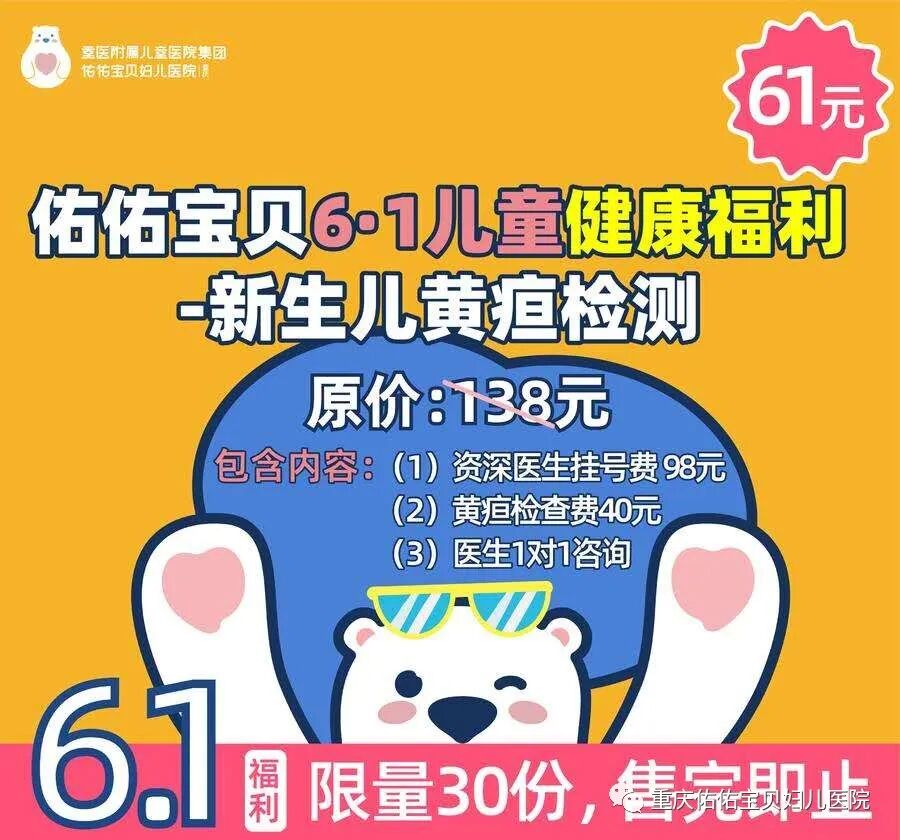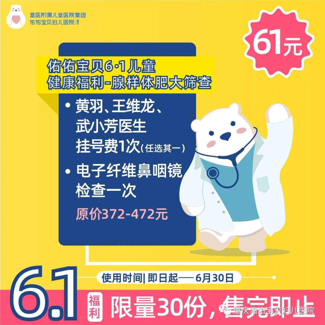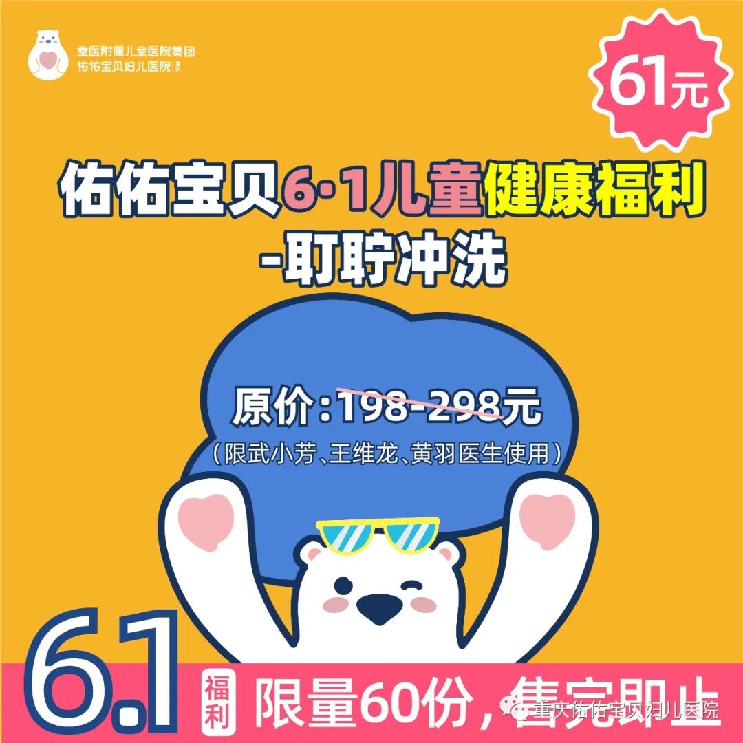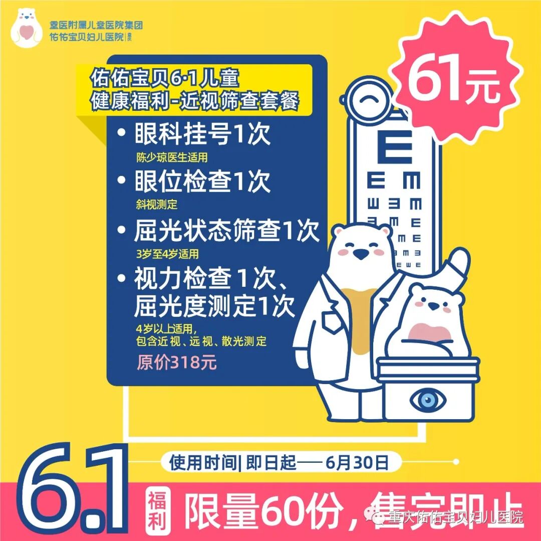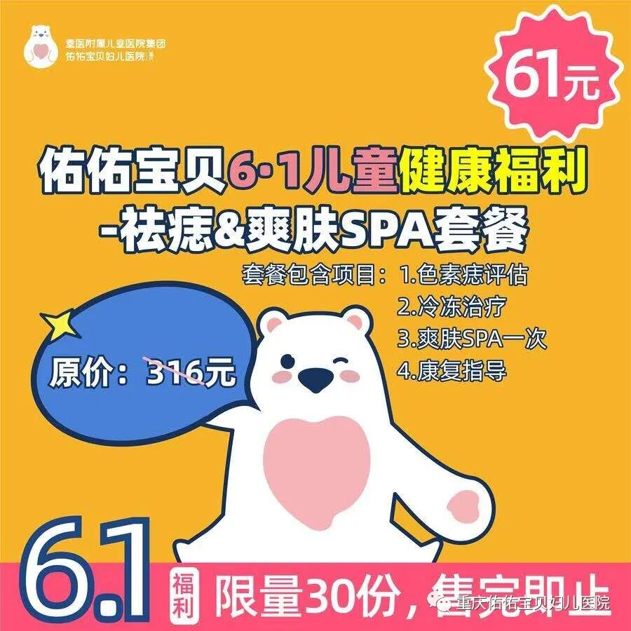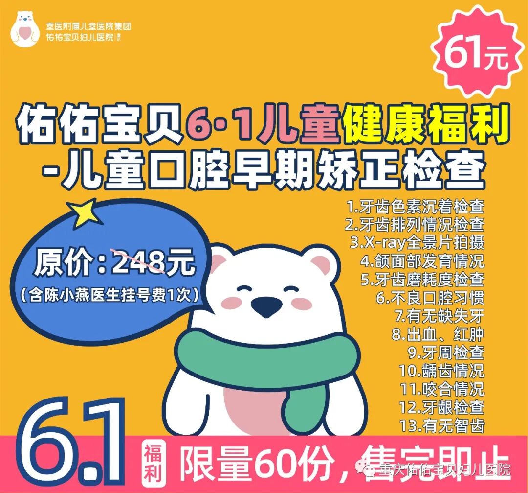 “六一”是孩子的节日!你,准备好了吗?是送娃漂亮的衣服或精心挑选的玩具?佑宝告诉你,这些并不是送给孩子最好的儿童节礼物,比这更有意义是带孩子做一次全面的体检!孩子健康,是每个家长最大的梦想在“六一”儿童节来临之际佑佑宝贝3大福利来袭给孩子专业健康守护限时优惠哦,速抢! 01 61元优惠套餐 身高预测套餐1 在这个长腿横行的时代身高,这可是每个当妈的都关心的大事都想女宝宝肤白貌美大长腿男宝宝高大帅气通南北 孩子将来会长多高呢?父母不高,孩子能突破遗传身高吗?孩子未来身高可以提前预测吗?孩子如何才能达到理想身高呢?这就需要身高预测检查帮孩子做好身高全面管理及时预警成长风险佑佑宝贝61元即可进行身高预测点击图片购买 祛痣(含爽肤SPA)套餐2  脸上肯定越干净越好,小孩也不例外痣,是一种很常见的皮肤症状说句实在的话,隐藏起来的痣还好但如果长在脸上那就...影响美观的程度可想而知想象一下,脸蛋原本白里透红没有斑没有痘但多了一颗,两颗,三颗痣那不是全毁了吗儿童时期祛痣是个比较好的选择但务必选择专业权威的医院点击图片购买 近视筛查套餐3 新冠肺炎疫情期间孩子宅在家里看电视、玩游戏、看书、写作业再加上“停课不停学”的号召孩子们用眼时间大大增加因此眼科检查很重要临近6.1儿童节佑佑宝贝福利送给您61元即可做近视筛查点击图片购买 儿童口腔早期矫正检查套餐4 牙齿就像一颗小树苗在每个生长阶段都需要精心呵护在小树苗有歪斜的情况时应及时靠外力扶正它3到15岁是儿牙矫治的黄金时期在孩子身体发育最旺盛的时候进行早期干预,不仅颌骨的塑形性强而且矫治简单更舒适治疗时间短,费用更低儿童口腔早期干预矫正不让孩子输在起跑线上点击图片购买 PT训练(大运动测评及训练)套餐5 俗话说“一举头,二抬胸,三翻六坐七滚八爬,九扶立周会走”从宝宝人生第一次体检开始家长们往往首先关注到宝宝的大运动水平:“医生,我家宝宝运动发育有没有达标啊?”儿童运动发育落后应如何追赶?可首选PT训练点击图片购买 小儿推拿套餐6  小儿推拿近几年来越来越受家长的推崇相比西医打针输液这是一种天然的治疗方法通过小儿推拿调理身体调整小儿的身体到达一个阴阳平衡的状态可以避免小儿反复生病的发生 在导致儿童疾病频发的夏季除了给幼儿注意饮食起居、保健防病外家长们不妨给孩子们做做小儿推拿搓揉间百病灰飞烟灭点击图片购买 腺样体肥大筛查套餐7 宝宝睡觉呼噜声不断嘴巴老合不上、牙齿也凸出来了细看之下,容貌还变丑了身为妈妈的你也许还不知道“腺样体面容”这回事  颜值暴跌始于口呼吸而口呼吸就始于腺样体肥大别再等等看了守住宝宝的颜值,一个检查就能搞定点击图片购买 耵聍冲洗套餐8  宝宝跟大人一样耳朵的耵聍腺也会有分泌物,俗称“耳屎”宝宝分泌耳屎可能堵塞外耳道也会影响卫生甚至会让宝宝不自觉得乱挠耳朵可由于宝宝外耳道小,耳朵皮肤娇嫩妈妈们都不知道该怎么帮宝宝清理耳朵了想好好清理宝宝的耳朵那就别错过耵聍冲洗套餐点击图片购买 体格发育检查套餐9 幼儿期体格发育对宝宝整个成长发育历程有着至关重要的作用每个宝宝的成长都顺应着体格发育的基本轨迹体格生长发育怎样才算正常这就需要体格发育检查来评估孩子的当前发育状态不做粗心爸妈及早发现孩子成长隐患61元即可搞定点击图片购买 新生儿黄疸检测套餐10  虽说“十个宝宝八个黄”但黄疸的高发生率、高住院率及严重的致残率让妈妈们揪心不已都说黄疸很常见,消退要多久?两周?还是两个月?如何判断宝贝中招的是哪一种黄疸?这些都是新手妈妈们最常见的疑虑为解决妈妈们的疑虑佑佑宝贝特推出新生儿黄疸检测点击图片购买 02 六一大礼包原价2417元的套餐仅610元即可购买包含以下所有套餐:骨龄检查、近视筛查、耵聍冲洗龋齿风险评估、祛痣(内含爽肤SPA)口腔13项检查、体格发育检查吸入性&食物性过敏原(19项)检测点击图片购买 03 6.1折限量购即日起至6月5日6.1折即可购买儿童体检套餐入园/入学/常规体检套餐每种套餐限量30份点击图片购买 孩子的健康是一个家庭的头等大事体检提前预约,无需排队儿科专家一对一体检温馨环境,私密体检,舒适化体验还犹豫什么?今年儿童节送孩子一份健康的呵护吧儿童的健康成长,需要悉心呵护