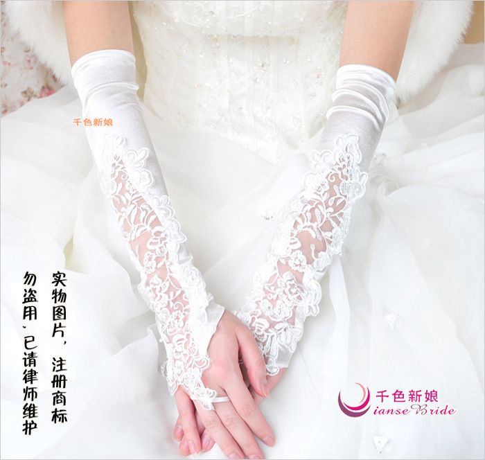 4、米白色38cm超长过肘绣花珠片-新娘长手套蕾丝花边无指
