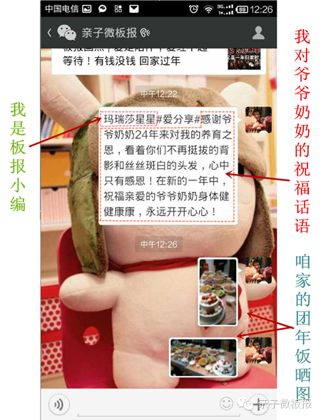 活动内容: 微板报的粉丝们,每天都可以拍下 过年喜庆图片发送到亲子微板报(如:春节团年饭、全家福照片、与父母,孩子精彩幸福瞬间),再附上一段对某某人祝福的话语!微板报将在第二天把这些满满的祝福发布出去!