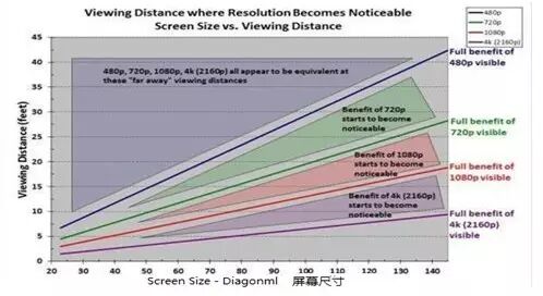 横轴:屏幕尺寸, 纵轴:观看距离,单位:英尺。(10英尺=3.048米)