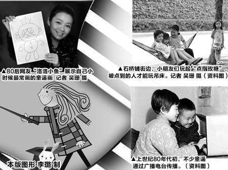 “城门城门几丈高?三十六丈高”、“红萝卜咪咪甜,看到看到要过年”、“点指玫瑰、玫瑰花糖,鸡倌收税,鸭倌退堂”……近日,在腾讯微博以及各大论坛,热传起了曾一度在我市流行的童谣,这些蕴含了大量重庆方言,简单直接又朗朗上口的童谣,唤起了人们对儿时的美好记忆,因此被网友们多次转载。但实际上,这些童谣已渐渐淡出人们的视线,对于不少90后、00后的网友来说,网络语言反倒是最熟悉的。民俗专业人士认为,在电子文化充斥生活的今天,无法吸引青少年兴趣的老童谣真的走到了末路。