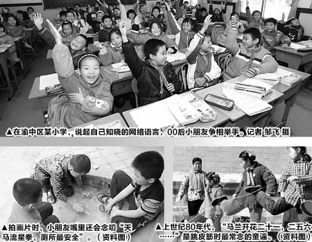 在上世纪80年代广为传播的童谣,到了21世纪之后,却很快从人们视线中消失了。12日中午,记者来到大坪小学四年级二班,全班共有54名10岁左右的学生。问及这些带着浓郁重庆方言的童谣,只有零零落落的4、5名小朋友举手表示,自己曾经从大人口中听到过,但记不全。而问及与网络有关的词语,“给力”、“神马都是浮云”、“有木有”,“Hold住”等等,却引起学生们的共鸣。全班学生家里都有电脑,会单独上网的学生超过全班总人数的三分之二,其中不少人还熟悉很多单机和网络游戏。