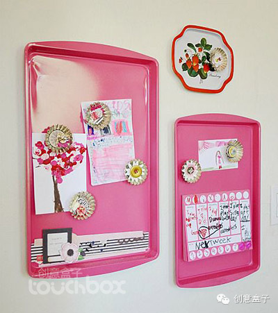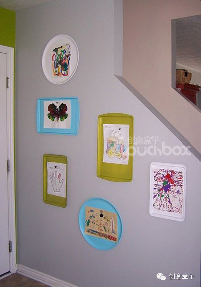 5.利用餐盘的几何形状和颜色,也可以做成美观的作品展示架,很巧妙的用法。