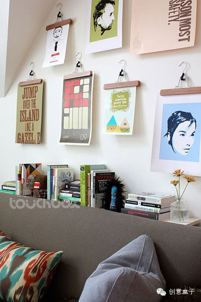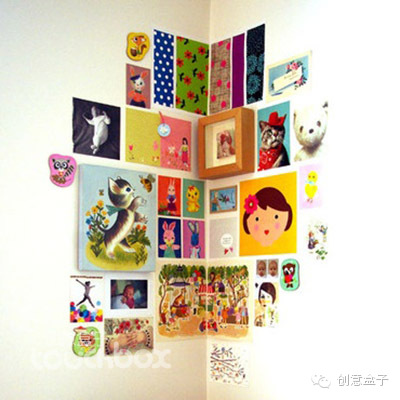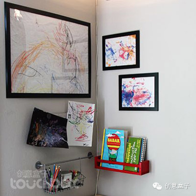 1. 小朋友的作品色彩都很丰富,如何将一堆色彩缤纷的作品摆放在一起,又不会给人视觉上的混乱,需要精心的安排,找一个类似下面图示中的角落作集中展示,即保证了展示的完整,又因为单独设立的空间而不会破坏家居的整体氛围。