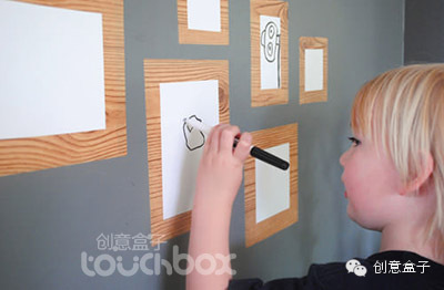 一大张纸贴于整面墙壁,手绘出大大小小的外框,这既是孩子自由的涂鸦天地,也是非常独特的展示空间。