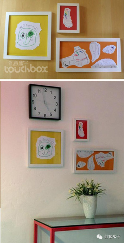 直接将孩子画的形象剪出来或撕出来贴在画框内,效果很有一种艺术的感觉。