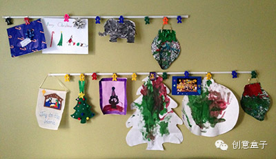 2. 绳子上的艺术品,这根绳子可以是晾衣绳,厨房用的挂绳,或者一根简单的毛线,钓鱼线,使用小木夹或者塑料夹来将作品固定。这种做法的好处是不必限制作品的尺寸,另外也非常方便拆卸和调整,比较灵活。